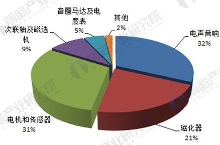目前,稀土永磁材料在核磁共振成像仪、电机、音响、磁选机、电度表、磁化器、传感器等器件上的应用有扩大之外,在高新技术、国防军工、工农业和家用电器等领域的应用取得了很大的进步。近年来在地震检波器、永磁除铁设备、磁渗药品、电动车、汽车等新应用发展较快。目前我国烧结钕铁硼在各个领域应用比例为:电声音响占 32%,磁化器占 21%,电机和传感器占 31%,磁联轴及磁选机占 9%,音圈马达及电度表占 5%,其他为 2%。