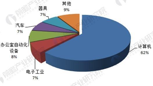 粘结钕铁硼永磁材料的生产及应用开发较晚,应用面不广,用量较小,主要用于办公室自动化设备、电装机械、视听设备、仪器仪表、小型马达和计量机械方面。近年我国粘结钕铁硼永磁材料的应用比例为:计算机占 62%,电子工业占 7%,办公室自动化设备占 8%,汽车占 7%,器具占 7%,其他占 9%。